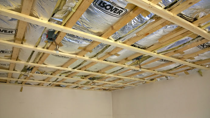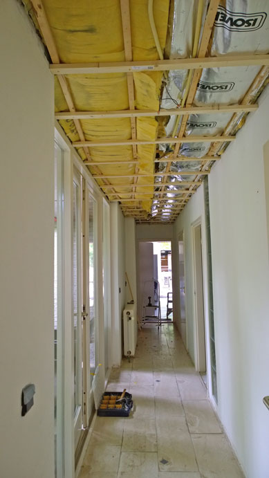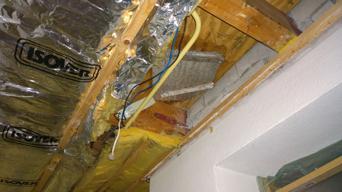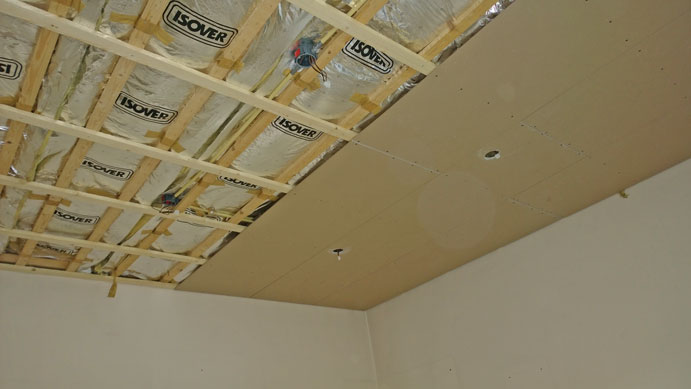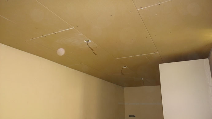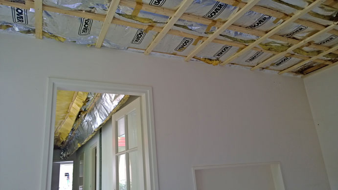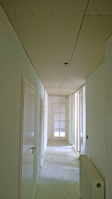 In een aanbouw 60 m2 plafond vernieuwd, schrootjes eruit en stucplafond erin,